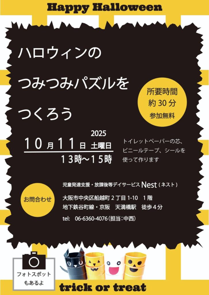 10月11日の親子療育イベント開催 2025年10月2日 最終更新日時 : 2025年10月2日 中西美穂 10月11日13時~15時は親子療育イベントを開催いたします。 ハロウィンということで、工作イベントを行います! ぜひ、ご参加ください!